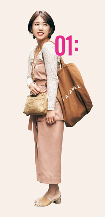 トレンドのヌーディカラーのコーデのときは、バッグもベージュ系で。ヴィンテージのチェーンバッグにはショッパートートで軽快さとこなれ感をプラス。使い勝手のいいサイズ感、ブランドバッグとのバランスの取りやすさで、最近はこれ一択。サンダルは、「マリアム・ナッシアザデー」。