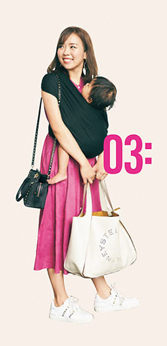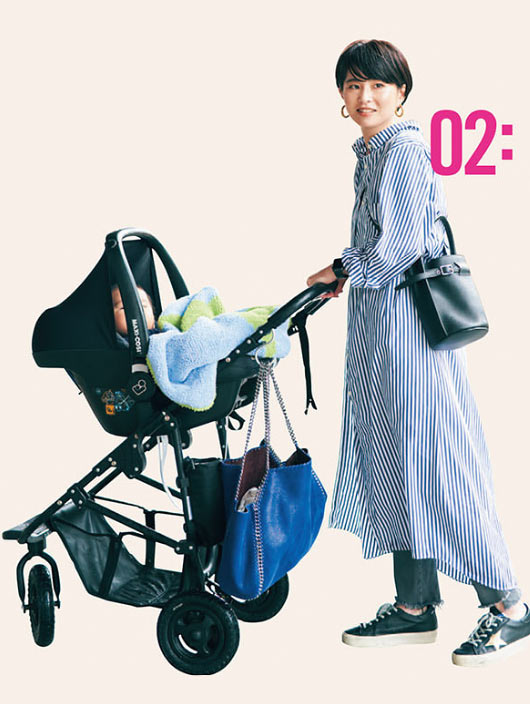 機能性重視の“マザーズバッグ”、は気に入るものがなく、乳幼児期が終わってもずっと使えるものという目線で、「ゴヤール」に。PVC素材の斜めがけは汚れや濡れも気にならず、バッグ大好き娘に取られても心配なくストレスフリーです。3カ月の息子を抱っこすることが多い今は、肌触りがよい「ベッド・アンド・ブレッ「クファースト」のワンピをヘビロテ愛用。