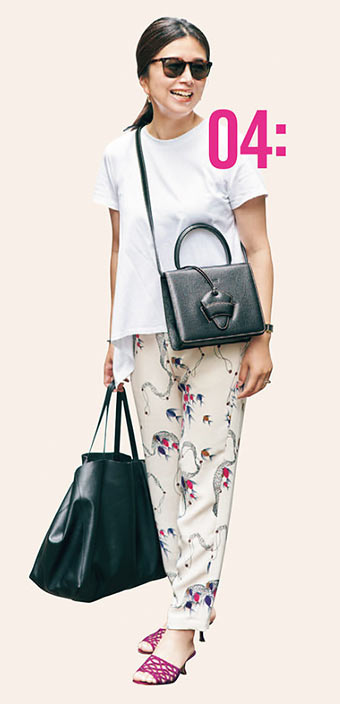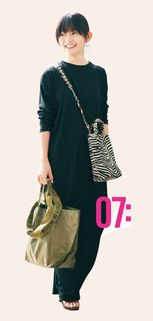 主人と共有しやすいシンプルさで選んだミニマルな黒トートは、容量の大きさも魅力。普段はベーシック派の私が柄物を着るときは、斜めがけバッグも黒で統一しメリハリを。変形デザインの白Tは「ユニクロ」。