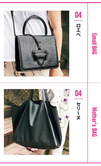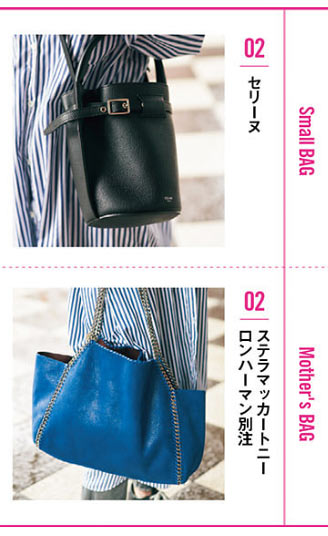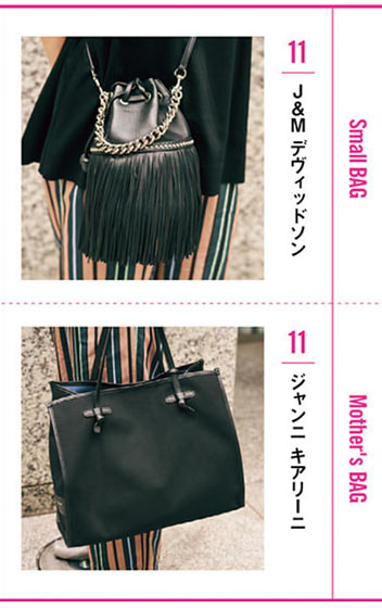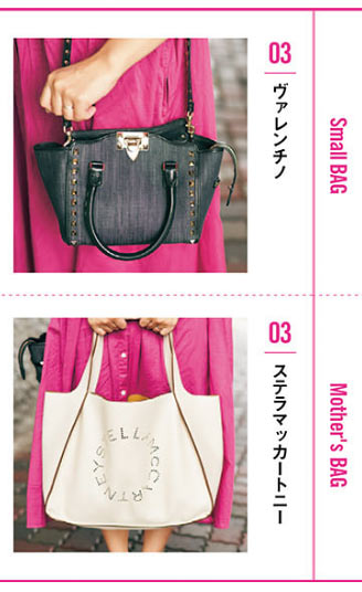 キレイ色の服を着ることも多いので、バッグはモノトーンでシックに。「ステラマッカートニー」のバッグは間口がさっと開いて荷物の出し入れがしやすく、エコレザーなので汚れてもすぐに拭ける扱いやすさが魅力です。「ヴ「ァレンチノ」のショルダーはブラックデニム素材で着る服を選ばずヘビロテ