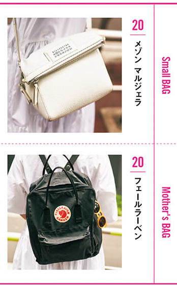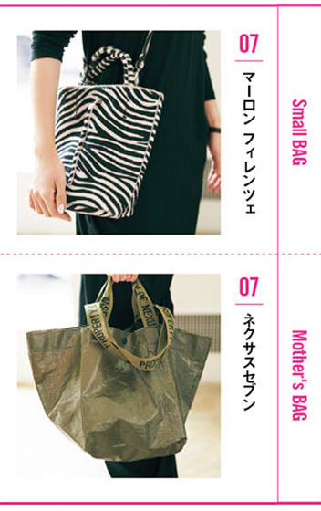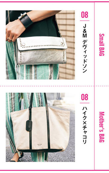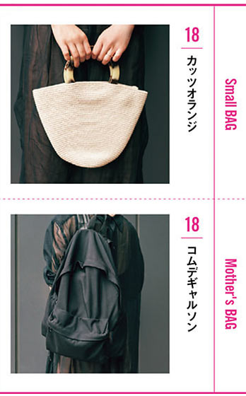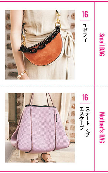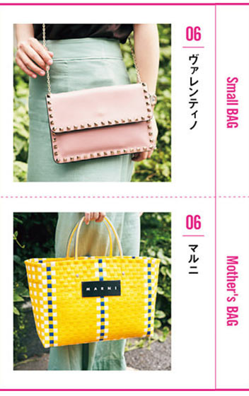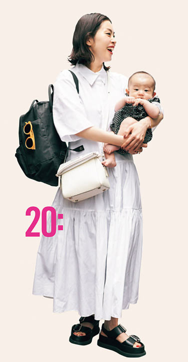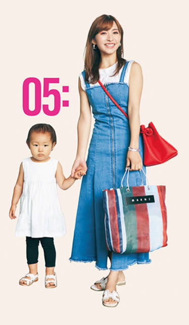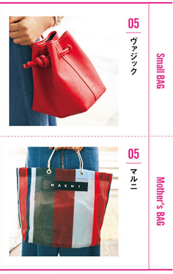 デニムコーデに赤をワンポイント差すような、ベーシックにバッグで色物を取り入れるのが今の気分。斜めがけした「ヴァジック」のボンドミニは、1つで旬感も出せるのでお気に入り。「マルニ」のマルシェバッグは、荷物が沢山入る&メッシュ素材で汚れにくいという、私のマザーズバッグ選びで大事にしているポイントを押さえた理想のバッグです。