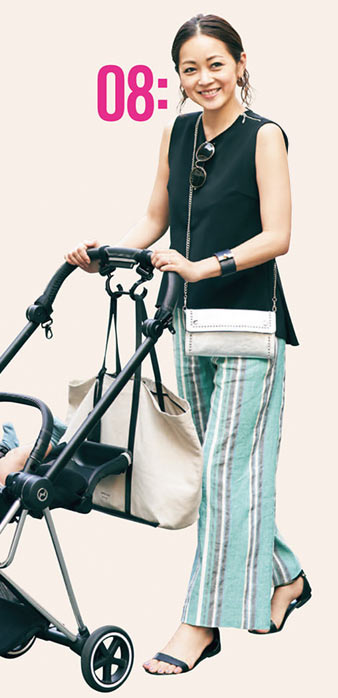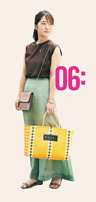 ベビーカー派のため、バッグは長時間フックに掛けても持ち手が伸びる心配がなく、大容量で型崩れしにくい点で「マルニ」のマーケットピクニックバッグを。小バッグも淡色ピンクにしてカラーonカラーのスタイリングに。さらに「マカフィー」のミントグリーンのスカートを合わせた、カラーミックスコーデがこの夏の気分です。