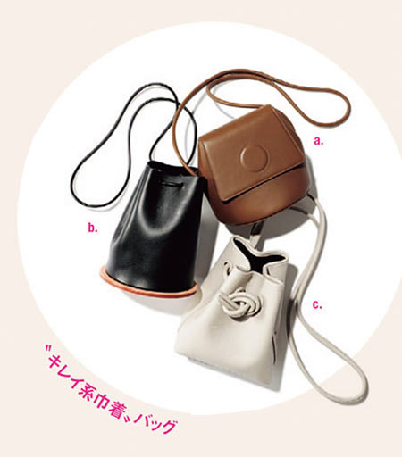 a.巾着的感覚で使える丸底デザイン。フラップがマグネットタイプなので開け閉めも簡単。バッグ[H16×W16×D13cm]\47,000(モダン ウィーヴィング)