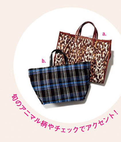 b.この秋も人気のチェックをバッグで取り入れるのも手。バッグ[H31.5×W53×D23cm]\12,000(ユナイテッドアローズ)