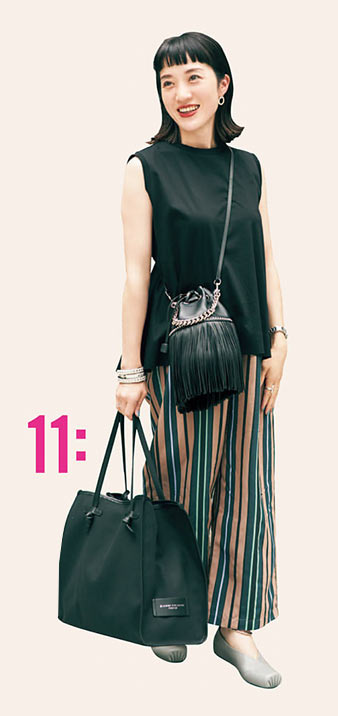 シンプル+αのデザインでがシャレている「ジャンニキアリーニ」の黒のトートは、大きいのに軽く、どんな服にも、どんな小バッグにも合う万能さも魅力。繊細なフリンジに太めのチェーンのモード感たっぷりの「J&Mデヴィッドソン」の新作フリンジカーニバルともフィット。足元は、トレンドの「ジルサンダー」のフラットシューズ。