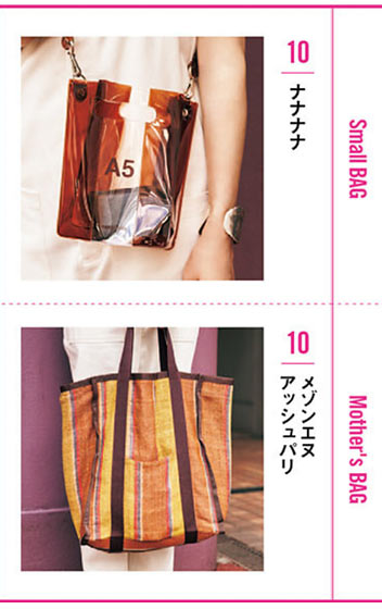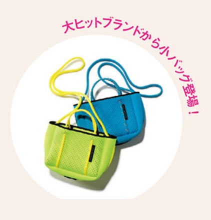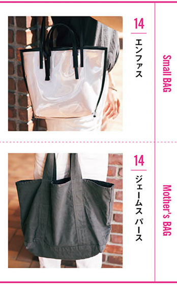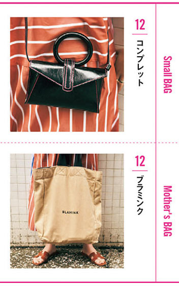「ブラミンク」のトートバッグは、軽くてマチも広く、キャンバス素材で丸洗い可能。2個持ちのときにどんなバッグとも相性のいい柔軟性もあります。小バッグは昨年日本初上陸したイスラエルの「コンプレット」。独創的なデザインが、ワンランク上のオシャレを叶えます。リゾート感のあるワンピは「ティエリーコルソン」のもの。