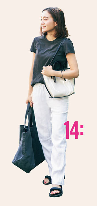 とにかくシンプルが気分の今、アイテム自体はベーシックながら、質感でニュアンスを足すスタイルにハマっています。トートバッグも奇をてらったことはしていないけれど、この絶妙な色味で褒められ率も高め。トレンドを意識したPVCバッグは、主張しすぎない透明タイプに。Tシャツとリネンパンツも、全身のトーンを揃えると、まとまり感もアップ。