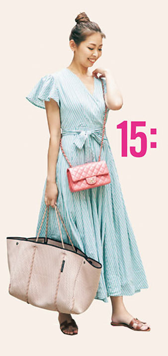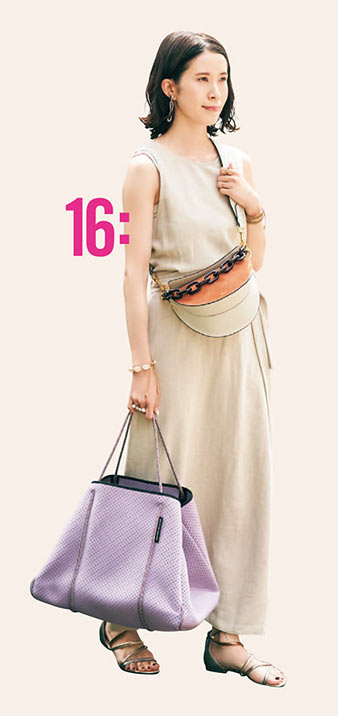ネオプレン素材のトートバッグは水際シーンでも使えて便利。これをオフィス使用するなら、べっ甲風チェーンがアクセントになった英国ブランド「ユゼフィ」の小バッグを合わせてきちんと感を加えて。ラベンダーとオレンジのカラーミックスで遊んだ分、麻素材のカラーレスな「シャイナモート」のワンピを合わせました。