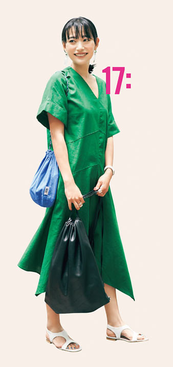 メンズっぽさやモード感のないニュートラルなナップサックは、コーデやシーンを選ばず、自転車行動の私にとても重宝。貴重品類は巾着バッグに入れ、必要ないときはリュックのバッグインバッグに。「メイブルー」で購入したこんな着映えワンピも、ゆるいバッグ2個持ちセットで気負わない普段着感が出ます。