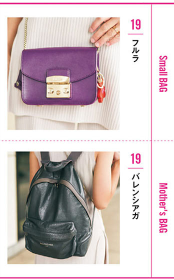 わんぱく2人との外出は、「とにかく両手を空けたい!」が第一優先。そこで選んだのが「バレンシアガ」のリュック。2年前に購入しヘビロテで愛用。リュックがカジュアルな分、小バッグで女らしさを加えていますが、「フルラ」のメトロポリスは私の最低限の必需品がピッタリ入りきるシンデレラサイズです!