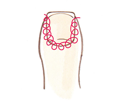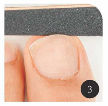 エメリーボードが少し上を向くようにツメの角に入れ、形を左右対称に整える。