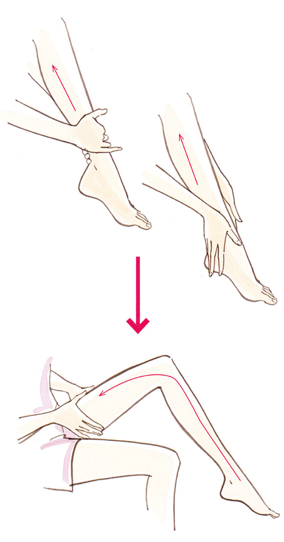 両手でくるぶしの上下をはさみ、気持ちよく感じる程度の力でそっとなでるように股下までさすり上げ、リンパを流します。次にくるぶしの左右をはさみ、さすり上げます(交互に各5~10回)。