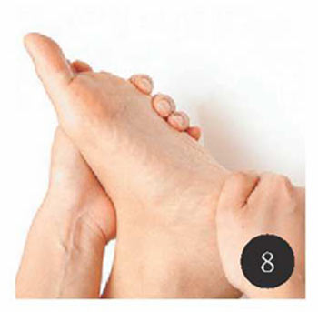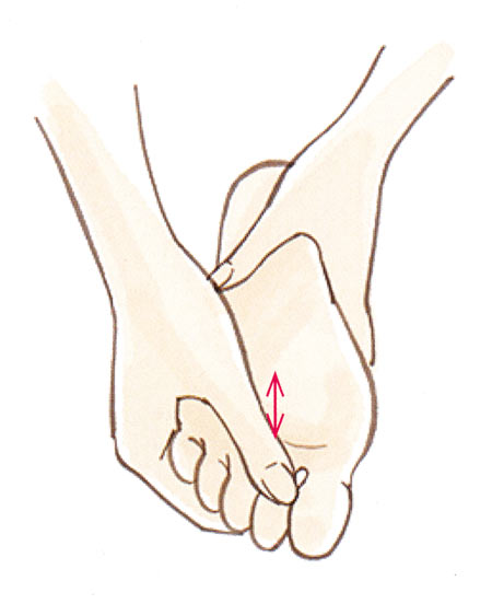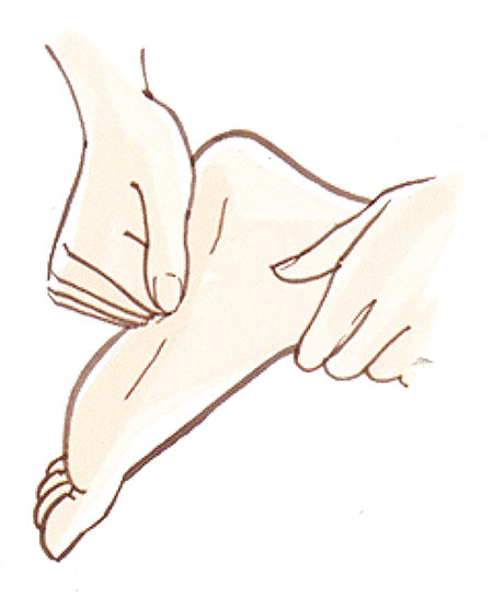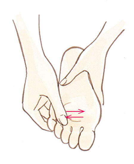 足裏の人さし指と中指のつけ根のくぼみを親指で上下にさすります。