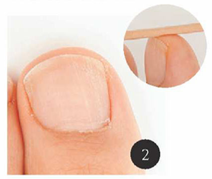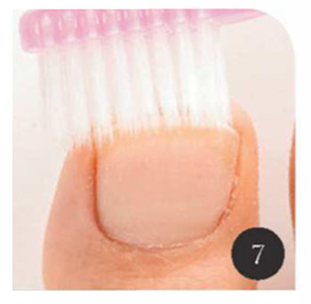 Fの歯ブラシでツメの間の汚れを掻き出す。先端の柔らかい、肌に触れても傷つかないものを使う。