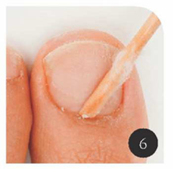 DにEを巻きつけて水で濡らし、貼りついている角質を優しく剥がし、甘皮を押し上げる。