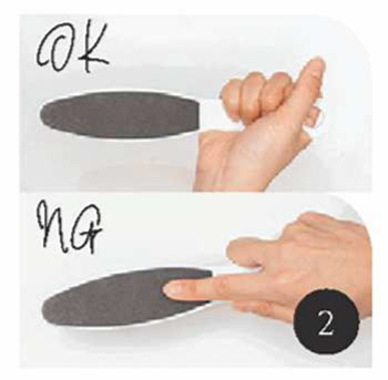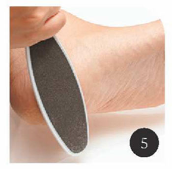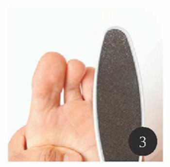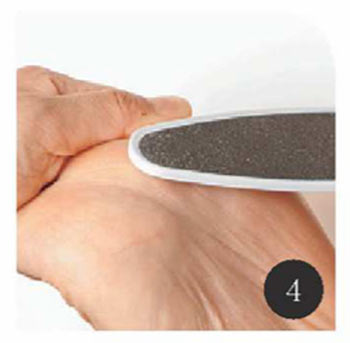 ファイルは一度ぬらして、タオルで拭いてから使用します。かかとから足裏の中央に向けて一方向にケア。ファイルがツーウェイになっている場合は、粗い面から細かい面で仕上げていきます。ごしごしとこするのはNG。