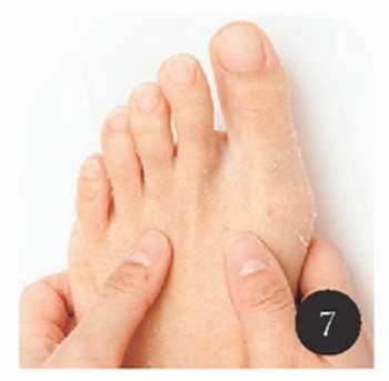 Bのスクラブで足の甲やくるぶし、指の上の角質を取り除く。