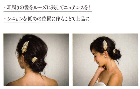 三つ編みで作るシニョンヘアは、低めにまとめてシックな印象に。クラシカルになりがちなシニョンこそラフに崩して今っぽさを表現して。ヘッドアクセはゴールドを選んで、王道への時こそオシャレ感を大切にしたい。