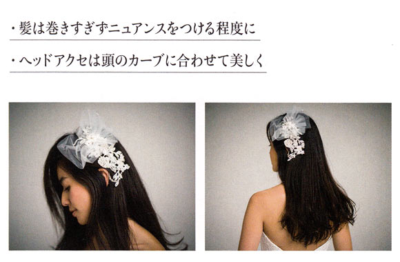 太めのこてでランダムに内巻きにして、柔らかい印象に仕上げます。前髪は、前に持ってきて内巻きにした後にかき上げることで大人っぽいニュアンスが。大ぶりのヘッドアクセを可憐なダウンヘアのアクセントに。