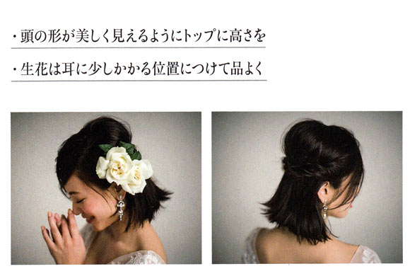 左右をねじってピンで留めた王道のハーフアップは、トップに高さを出して華やかに。毛先を作り込まないことで大人の雰囲気が漂います。可憐な白バラはグリーンとセットで使うことでフレッシュな魅力がアップします。