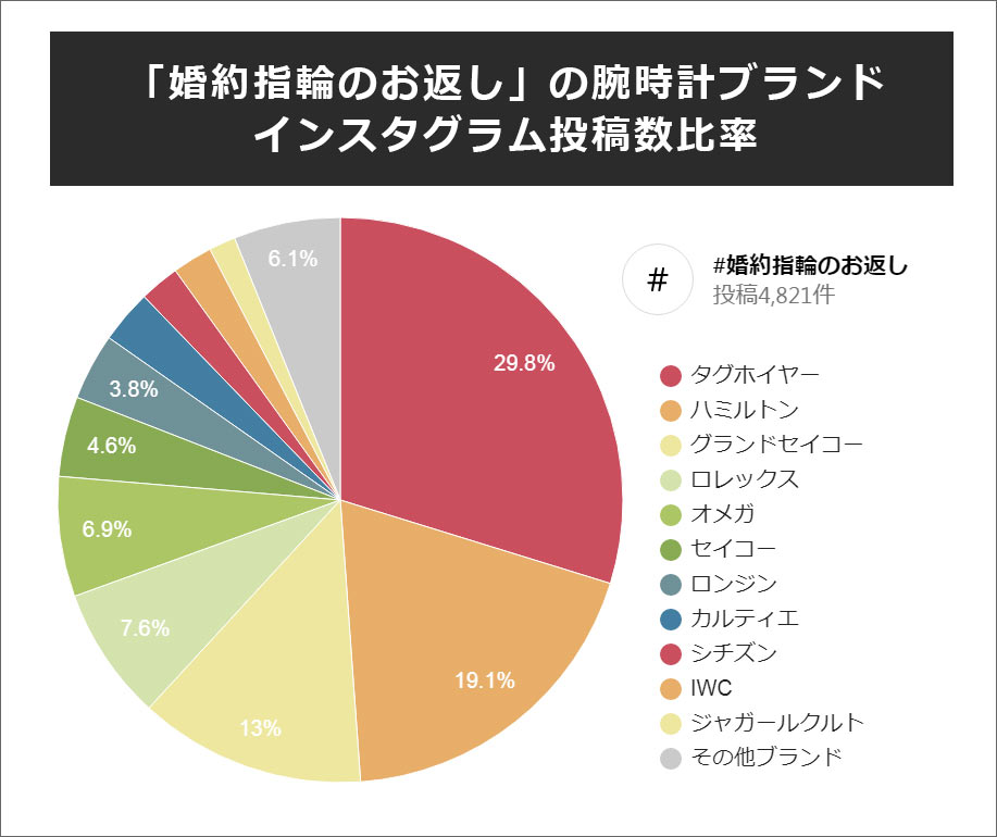 インスタグラムの「#婚約指輪のお返し」4821投稿の中から、腕時計を選んだ方の投稿(腕時計ブランド)を集計し、算出しました。
