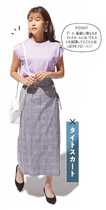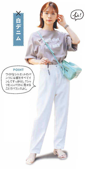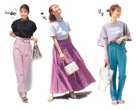 「①OL向けTシャツ」で紹介した4アイテムにあわせるボトムをピックアップ。夏この4枚されあれば乗り切れる!