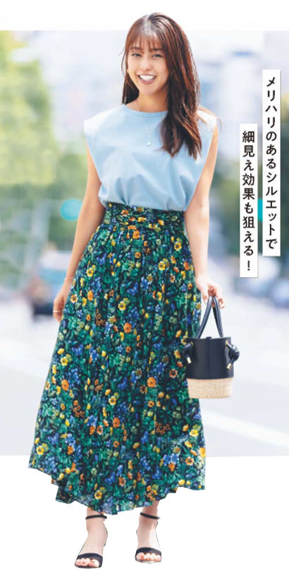 スカート \13,000ノーク、サンダル \3,289 / ティティベイトバッグ \14,300 / ダイアナ、ネックレス \1,700 / アメリカンホリック、イヤーカフス \5,720 / リリーズ