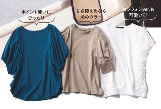 (右)首もとの開き具合で女性らしさを。Tシャツ \3,850 / サージュブティック