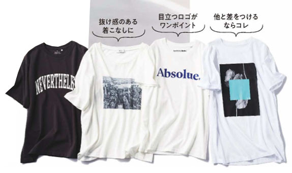 1枚で主役級の存在感を放つロゴTと、大流行中のフォトTはそれだけで映える! 大人は控えめなプリントを選んで。淡いトーンで爽やかにまとめて。