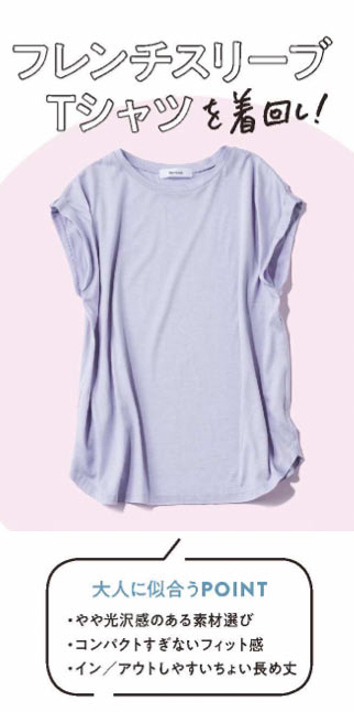 肩をやや覆うくらいの袖丈のフレンチスリーブ。タンクトップよりも着やすくて、半袖タイプよりも女っぽく華奢に見える!