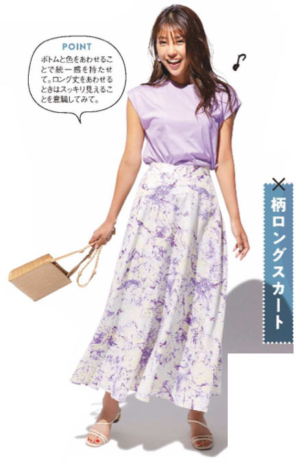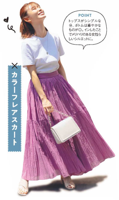 ■Tシャツ \5,500 / リノーム バイ エーティー、スカート \24,200 / カデュネ、サンダル \15,400 / ダイアナ、バッグ \25,300 / ヴィオラドーロ、ネックレス \31,900 / アナブノエ、ブレスレット \8,800 / ウノシエル