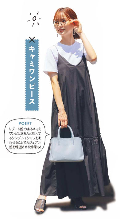 キャミワンピース \16,500 / アクテ、サンダル \1,980 / ハニーズ、バッグ \5,390 / カシュカシュ(アンビリオン)、メガネ \13,200レンズ代込み / ジンズ、イヤリング \2,860 / アネモネ