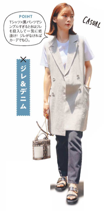 ジレ \28,600 / ラブティックボンボン、デニム \6,500 / ミテバッグ \14,300 / ダイアナ、ネックレス \1,980 / アネモネ、サンダル \6,500 / オリエンタルトラフィック