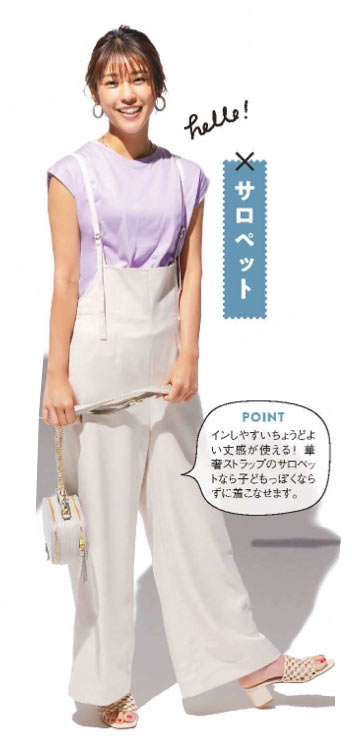 サロペット \22,000 / ジャスグリッティー、サンダル \6,500 / オリエンタルトラフィック、バッグ \14,300 / ダイアナ、ピアス \1,900 / アメリカンホリック、ネックレス \11,00 / オクト