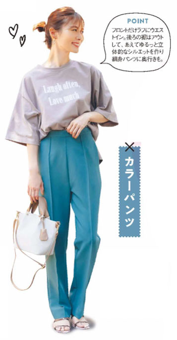 ■Tシャツ \9,500 パンツ \13,000 / ともにノーク、パンプス \6,930 / テチチ、バッグ \6,490 / カシュカシュ、イヤリング \1,980 / アネモネ、時計 \11,990 / クルース
