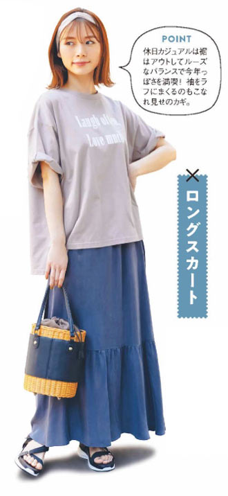 スカート \1,999 / グレイル、サンダル \6,500 / オリエンタルトラフィック、バッグ \2,530 / 神戸レタス、イヤリング \1,430 / アネモネ