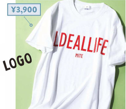 (左)胸もとに添えられた丸みのあるフォントのロゴが可愛げアクセント。Tシャツ \980 / ハニーズ