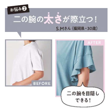二の腕ラインを隠し、さらに視覚効果で華奢見えを叶えるフリルデザインが細見えの秘訣!