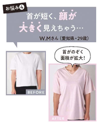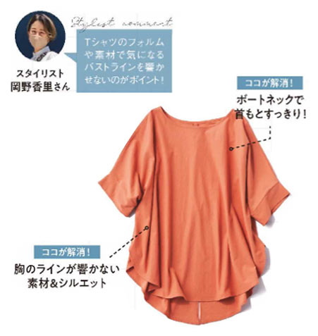 バストが響かない、とろみ素材&ボートネックのTシャツが正解!