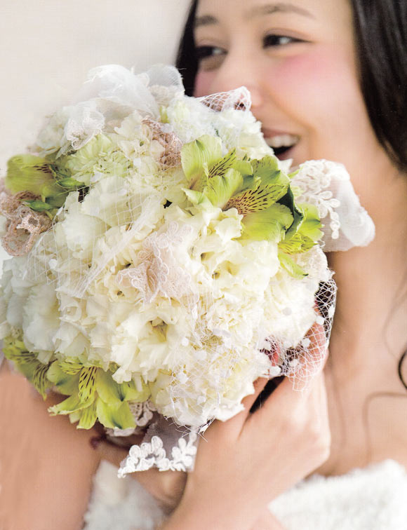 野の花を摘んできたような、ナチュラル感たっぷりのクラッチブーケは、軽やかな素材のドレスに。ホワイトからグリーンへのグラデーションが、初々しい花嫁を表現。フランネルフラワーやゼンマイなど、ユニークな花材が描く動きのあるシルエットも個性的。