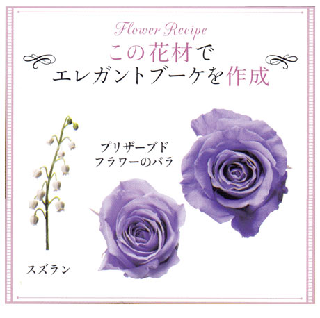 ■花材:バラ(プリザーブドフラワー)、スズラン、ライラック、プミラ、ビバーナムティナス(以上アーティフィシャルフラワー)参考価格:\40,000