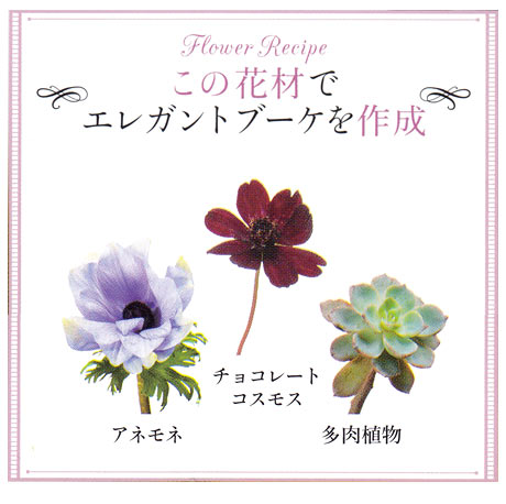 ■花材:アバランチェ、エリンジューム、アネモネ、多肉植物、チョコレートコスモス。参考価格:\25,000