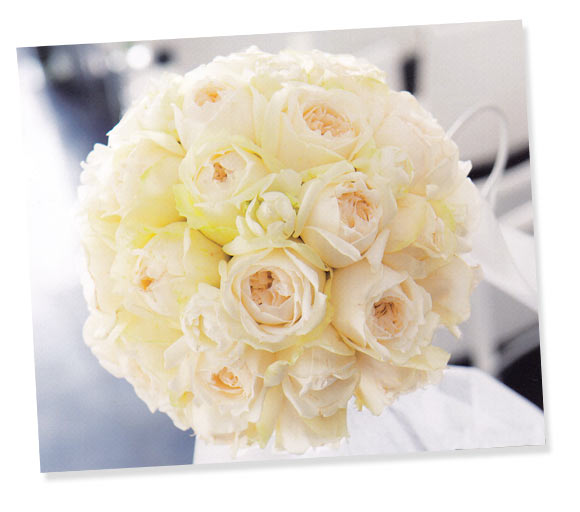コロンとしたフォルムがフェミニンな大輪のシェドゥーブルに、繊細なスプレーバラをミックスした、白バラだけのラウンドブーケは、どんな会場にもドレスにもマッチするのが魅力。シンプルな中にも、透明感のある大人の可愛らしさを表現して。