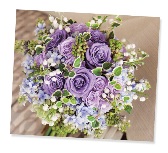 上品なバラとライラックが彩るブルーグラデーションに、可憐なスズランやプミラをあしらったナチュラルステムのブーケは、ジューンブライドやサマーウエディングにぴったり。揺れるスズランの花から、幸せのベルが聞こえてきそう。