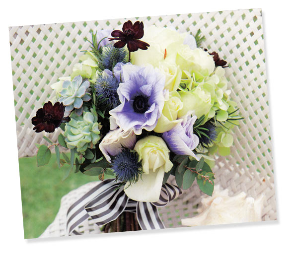 優雅に咲くオフホワイトのアバランチェに紫のアネモネ、ワイルドな趣のエリンジュームや多肉植物など、質感がまったく異なる花々をまとめた、個性溢れるクラッチブーケ。ダークな色彩のチョコレートコスモスと、ストライプのリボンが洗練された印象に。