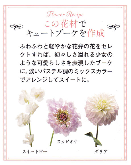 ■花材:バラ、ラナンキュラス、ダリア、スイートピー、スカビオサ。参考価格:\42,000