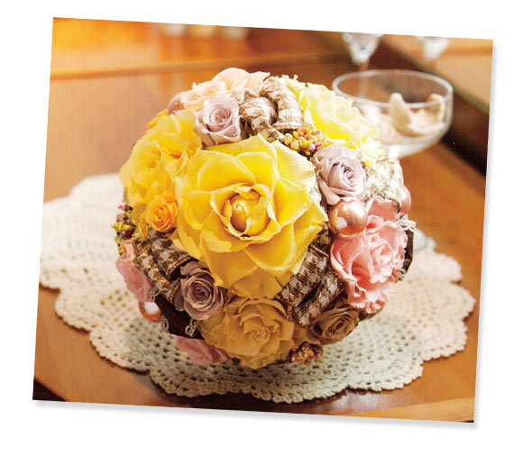 小ぶりなラウンドブーケでも、プリザーブドフラワーならではの軽やかな色合いと大小のバラを組み合わせた立体感で印象的に。チェックのリボンはブラウンをセレクトすることで甘さを抑えて。スイートなだけじゃないデザインは、スタイリッシュなドレスにも。