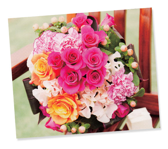眩ゆいオレンジのバラに同じトーンのピンクのバラを合わせた、明るく元気なイメージのラウンドブーケ。淡いピンクのスイトピーやカーネーションが作り出す軽やかなフリルが、花嫁の可憐な表情を引き立て、愛らしいピンクのヒペリカムがナチュラル感もプラス。