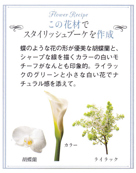 ■花材:胡蝶蘭、カラー、ライラック、アジサイ、利休草。参考価格:\50,000