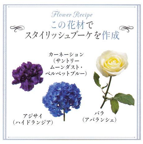 ■花材:カーネーション(サントリームーンダスト・ベルベットブルー)、アジサイ(2種)、バラ参考価格:\35,000